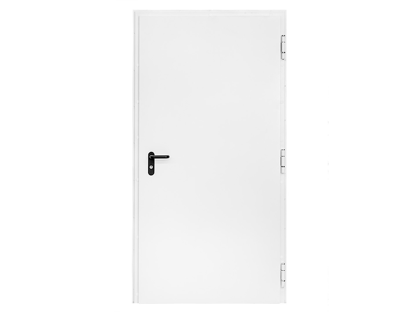 Brandschutz-Türelement EI 30. Türblatt aus Stahlblech, 3-seitig gefalzt, 64 mm stark. Füllung aus Mineralfaserplatte. Ausgeschäumter Blockrahmen, ohne Schwelle. Ganze Türe grundiert in Farbe Verkehrsweiss ähnlich RAL 9016 (bauseits Nachbehandeln). Einsteckschloss mit Kaba-Ausschnitt und schwarzer Drückergarnitur. 2 St. 3-teilige Konstruktionsbänder und 1 St. 3-teiliges Federband.